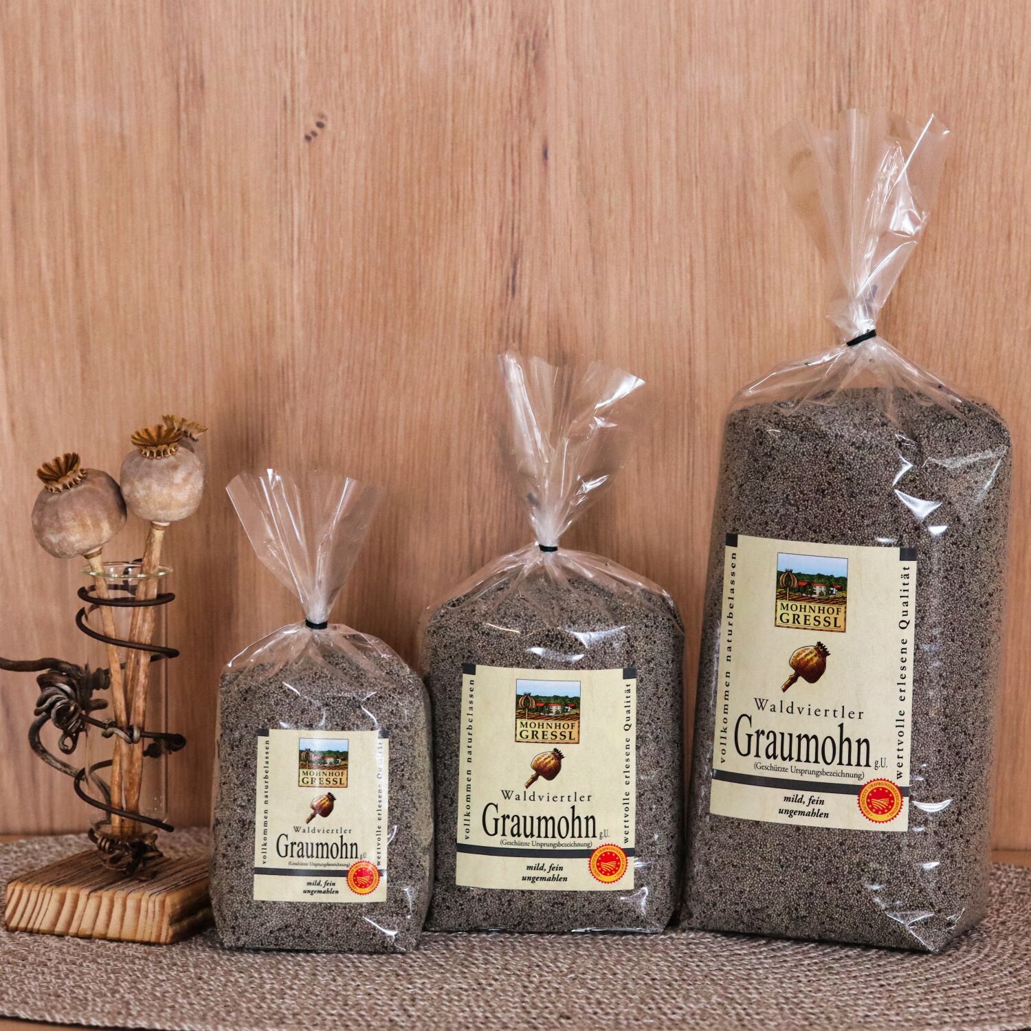 Ist eine Mohnsorte mit hellgrauer Samenfarbe und sehr feinem Mohngeschmack. Graumohn wird nur regional angebaut (Wald- und Mühlviertel) auch ist diese Mohnsorte aufgrund einer dünnen Samenschale empfindlich bei maschineller Ernte und kann daher